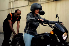 在沙特東部省胡拜爾saso辦理的哈雷戴維森經(jīng)銷商店,saso驗(yàn)貨一名女子在教練的協(xié)助下騎上這輛殿堂級(jí)的電單車。
