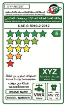 ESMA2011413日頒布實(shí)施國(guó)家能源效率和保護(hù)計(jì)劃(EESL)。依據(jù)該計(jì)劃,ESMA2011年開始,先后將空調(diào)、洗衣機(jī)、冰箱納入EESL的管控范圍。所有在管控范圍內(nèi)的產(chǎn)品,都必須通過(guò)產(chǎn)品測(cè)試以獲取能效證書,并加貼能效標(biāo)簽(如左圖),方可進(jìn)入阿聯(lián)酋市場(chǎng)。