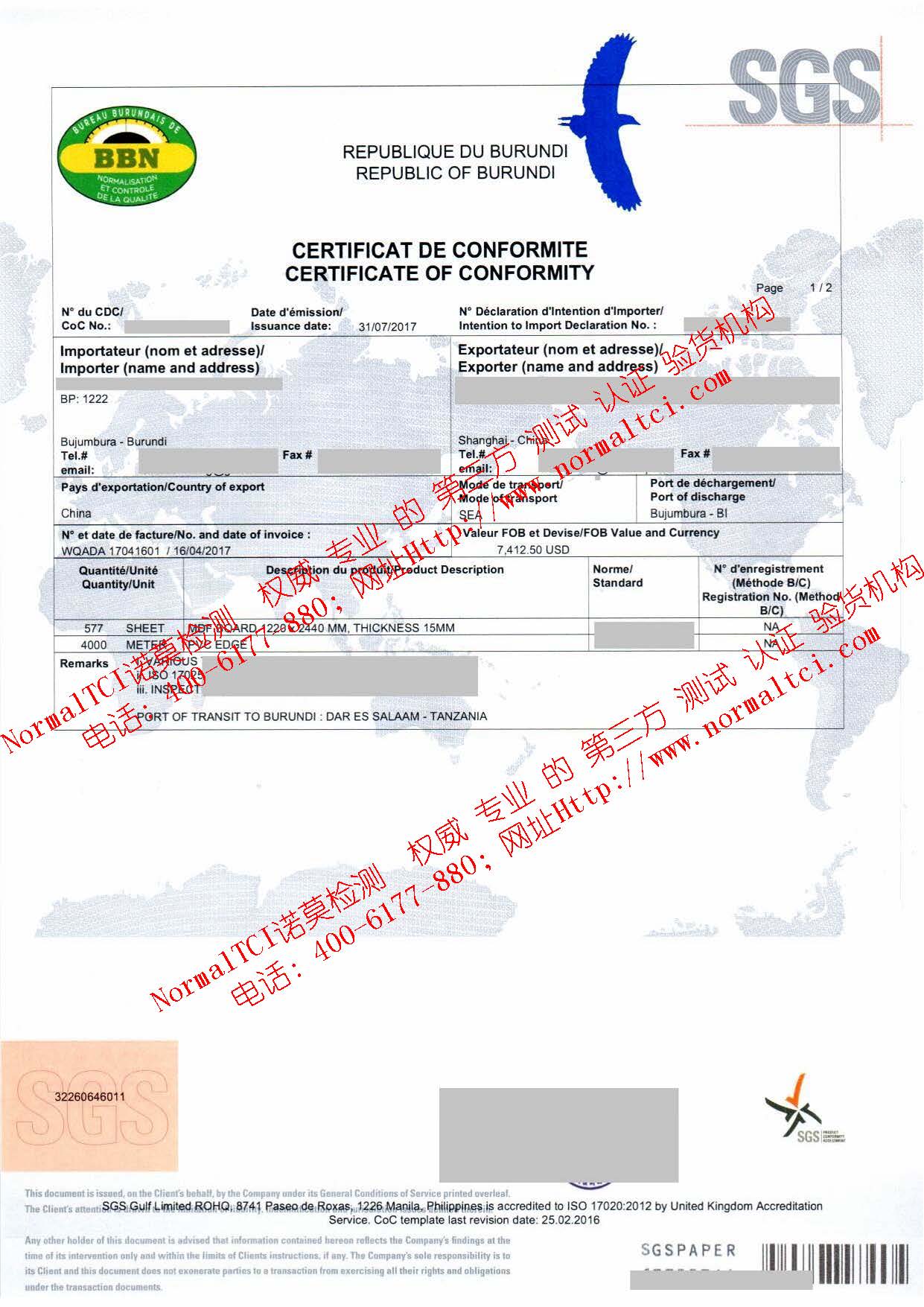 布隆迪COC證書樣本: