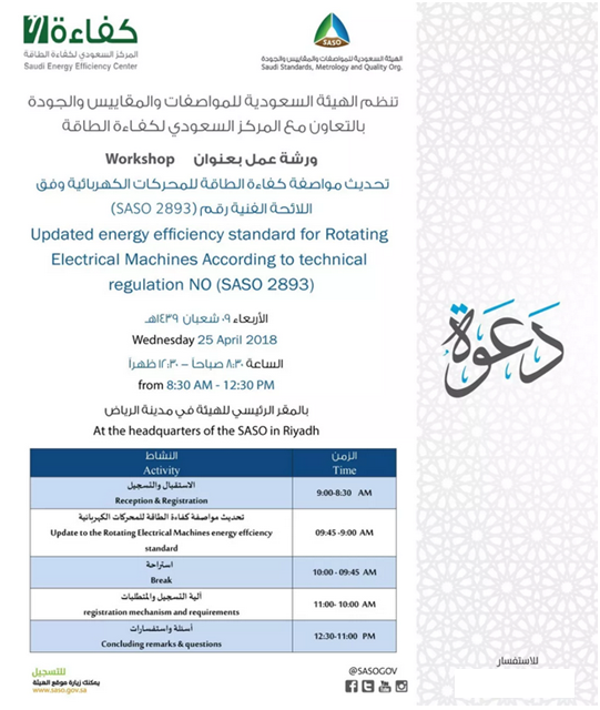 近日,沙特阿拉伯標(biāo)準(zhǔn)組織SASO發(fā)出了邀請(qǐng)函,通知各相關(guān)企業(yè)其將于4月25日在位于利雅得的SASO總部舉辦一場(chǎng)關(guān)于旋轉(zhuǎn)電機(jī)產(chǎn)品能效標(biāo)準(zhǔn)更新的研討會(huì)。當(dāng)天,SASO專員會(huì)在現(xiàn)場(chǎng)親自為大家對(duì)技術(shù)法規(guī)SASO 2893的新能效標(biāo)準(zhǔn)和其產(chǎn)品注冊(cè)機(jī)制及要求進(jìn)行詳細(xì)地指導(dǎo),并給予現(xiàn)場(chǎng)來賓自由討論的時(shí)間以便征求更多來自市場(chǎng)的反饋和意見。