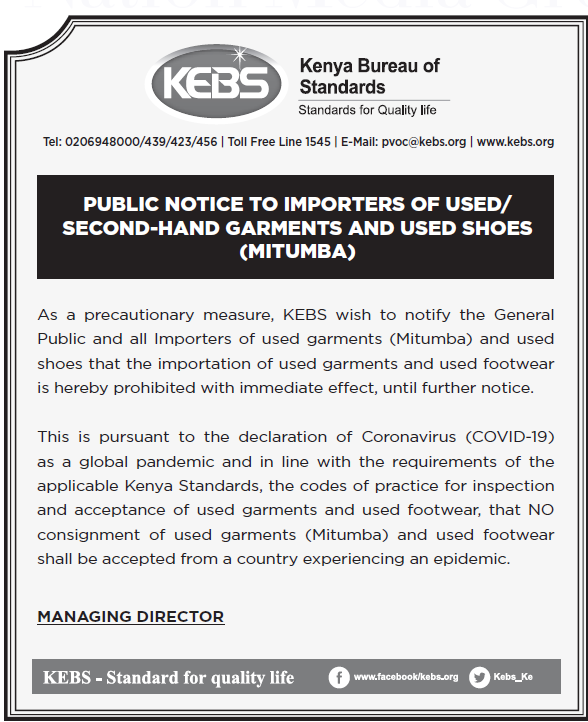 肯尼亞標(biāo)準(zhǔn)局KEBS禁止二手服裝與二手鞋類產(chǎn)品進(jìn)入肯尼亞市場(chǎng)