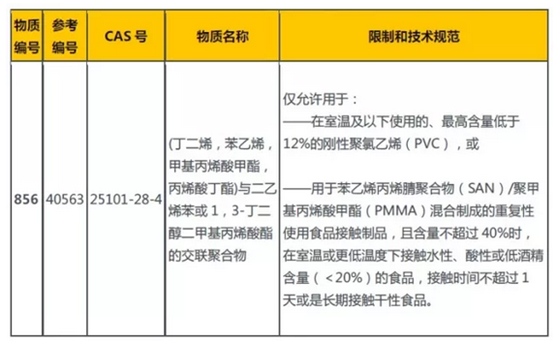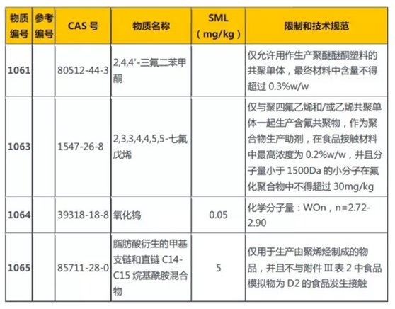 2018年1月19日,歐盟官方公報(OJ)發(fā)布與食品接觸的塑料制品法規(guī)(EU)10/2011的修訂法規(guī)(EU) 2018/79。歐盟食品級塑料法規(guī)從(EU)10/ 2011發(fā)布以來,已歷經(jīng)9次修訂。 (EU)2018/79作為第9次修訂, 更新了(EU)2011/10附錄I的授權(quán)清單, 新增了新增2,4,4'-三氟二苯甲酮、2,3,3,4,4,5,5-七氟戊烯、氧化鎢、脂肪酸衍生的甲基支鏈和直鏈C14-C15烷基酰胺混合物等4項授權(quán)物質(zhì),并擴大了(丁二烯,苯乙烯,甲基丙烯酸甲酯,丙烯酸丁酯)與二乙烯苯或1,3-丁二醇二甲基丙烯酸酯的交聯(lián)聚合物的使用范圍。