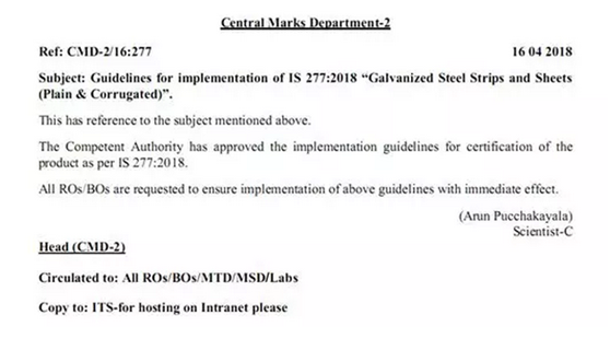 BIS于4月6日發(fā)布的CMD-2/16:277號文件,IS 277:2003版標(biāo)準(zhǔn)“鍍鋅鋼薄板(平板和波紋板)”已換版至IS 277:2018版“鍍鋅鋼帶與薄板(平板和波紋板)”,并且新標(biāo)準(zhǔn)已經(jīng)發(fā)布。2018年8月18日起,IS 277:2003版標(biāo)準(zhǔn)將廢除。此文件于4月16日通過主管部門批準(zhǔn),鍍鋅鋼卷與薄板產(chǎn)品將按照IS 277:2018版標(biāo)準(zhǔn)進(jìn)行認(rèn)證。通知從發(fā)布之日起立即生效。