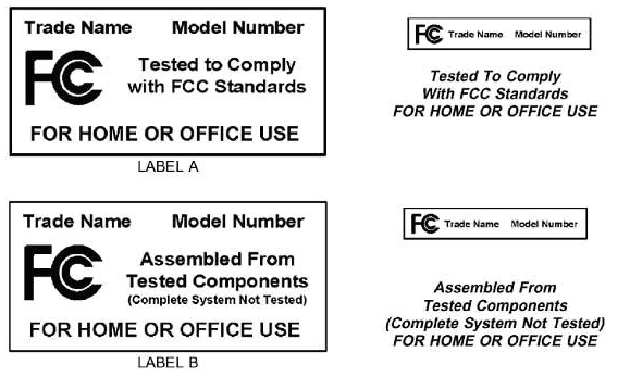 設(shè)備負責方(一般為制造商或進口商)在FCC指定的合格檢測機構(gòu)對產(chǎn)品進行測試,以確保設(shè)備符合相關(guān)的技術(shù)標準并保留檢測報告,F(xiàn)CC有權(quán)要求負責方提交設(shè)備的樣品或產(chǎn)品的檢測數(shù)據(jù)。適用于符合性聲明的設(shè)備包括家用電腦及外設(shè)、民用廣播接收器、超再生接收器、FCC RulePart 15的其它接收器、電視機接口設(shè)備、電纜系統(tǒng)終端設(shè)備和Part 18 的大眾消費者使用的工業(yè)科研和醫(yī)療設(shè)備。負責方應使設(shè)備上有如下標記: