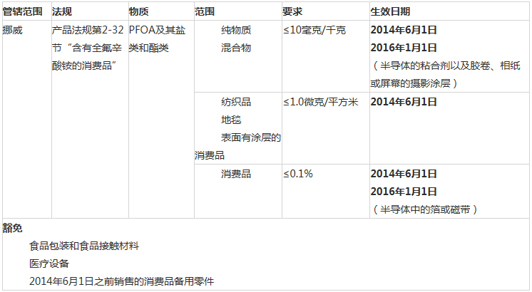 2013年6月28日,挪威環(huán)保局宣布了一項(xiàng)消費(fèi)品中PFOA及其鹽類和酯類的國家禁令。限制令適用于固體和液體產(chǎn)品,也包括紡織品。