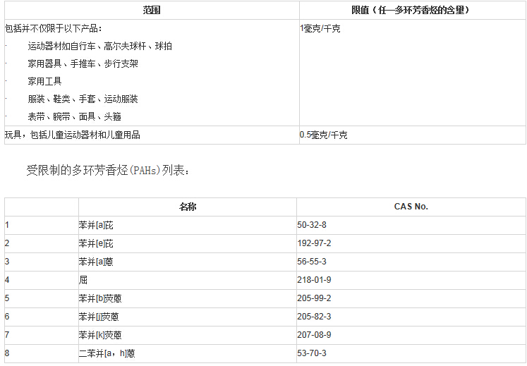 REACH法規(guī)附錄17第50條主要是限制輪胎的填充油中的多環(huán)芳香烴(PAHs),此次提案將多環(huán)芳香烴(PAHs)的限制擴(kuò)展到了能長期或短期重復(fù)接觸皮膚或口腔的產(chǎn)品。具體信息如下: