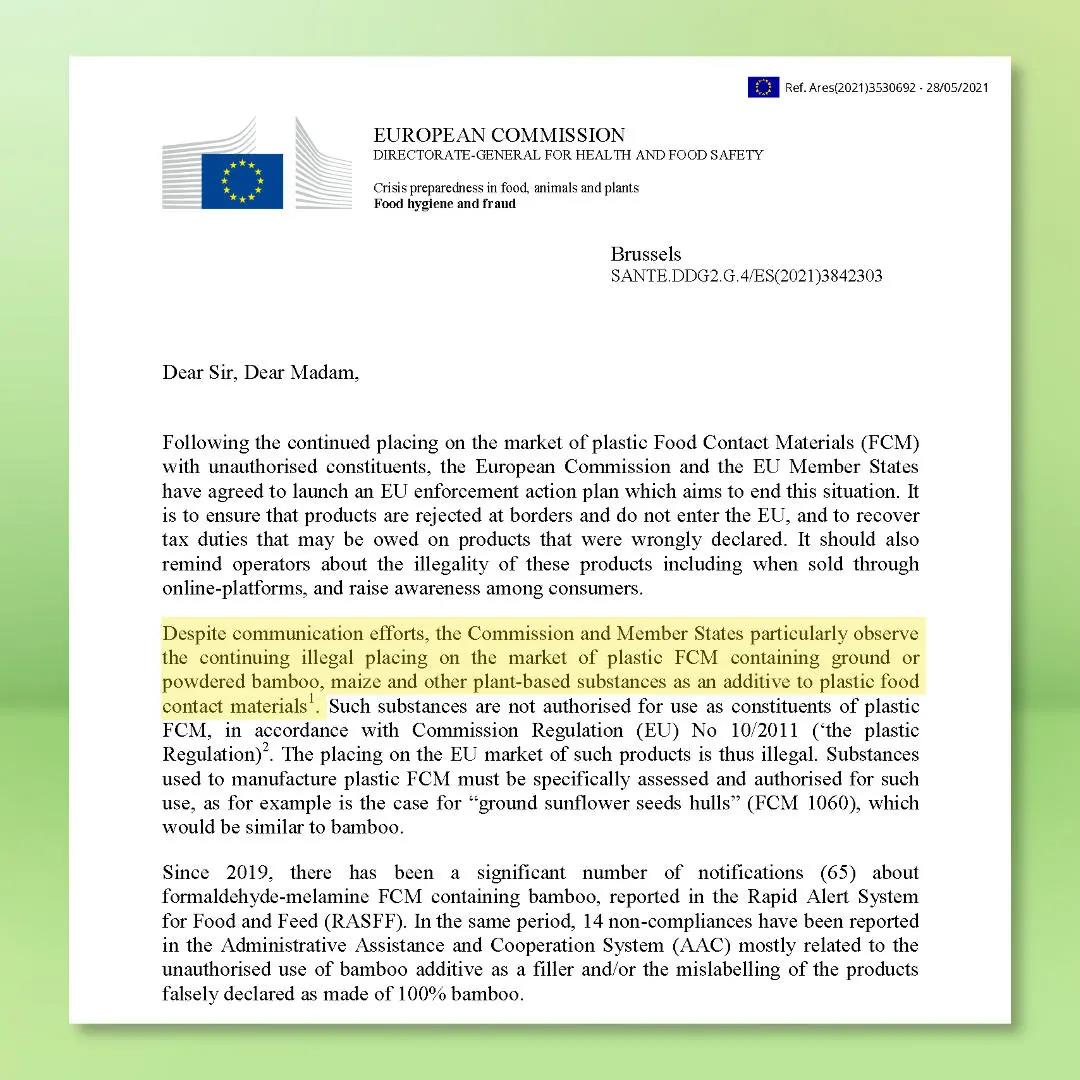 2020年8月,歐洲委員會(huì)食品接觸材料專家工作組澄清了關(guān)于含有竹粉或其他類似成分的塑料材料和制品的使用和投放市場(chǎng)的許可情況。明確指出(EU) NO 10/2011未許可碎竹、竹粉、玉米淀粉等類似物質(zhì)作為添加劑在塑料材料及制品中使用。