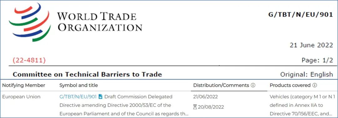 2022年6月21日,歐盟委員會(huì)向WTO的TBT委員會(huì)提交G/TBT/N/EU/901通知,擬對(duì)歐盟ELV指令(End-of Life Vehicles, Directive 2000/53/EC)的附件II(豁免清單)中用于加工用途的鋁合金,銅合金和某些電池中的鉛的豁免條款進(jìn)行更新。
