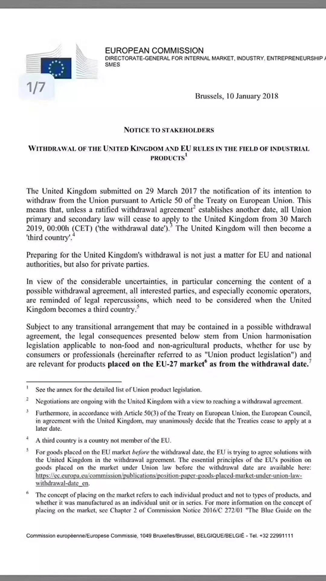 2018110日,歐盟委員會發(fā)布一份給利益相關(guān)方的通告,《Notice to Stakeholders: Withdraw of theUnited Kingdom and EU Rules in the Field of Industrial Products 說明了一些英國退歐對于工業(yè)產(chǎn)品相關(guān)方面歐盟規(guī)則的事宜。