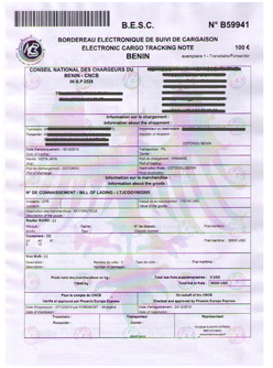 根據(jù)貝寧國法令,凡發(fā)貨至貝寧科托努 (COTONOU) 港或經(jīng)由此港轉(zhuǎn)往其他目的地的貨物都必須申請電子貨物跟蹤單BESC,BESC全稱為:BORDEREAU DE SUIVI DE CARGAISON。